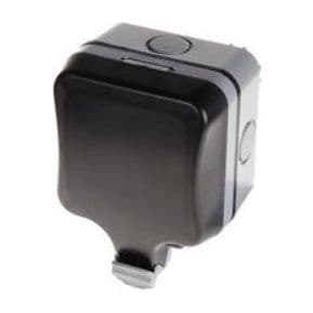 An BG 1 gang 13A IP66 Rated switched socket. and supplied with a multiple knock-out mounting box.